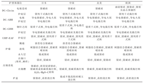 摘 要:由三根電極的普通交流電弧爐發(fā)展為超高功率(UHP)及一根電極的直流(DC)電弧爐,爐體結構有一些改變。針對各部位的損毀因素,內襯用的耐火材料也有所發(fā)展。例如普通電弧爐的爐頂用高鋁磚、爐墻鎂磚砌筑,而UHP及DC電弧爐采用大面積水冷爐頂、爐墻,爐頂三角區采用剛玉澆注料或預制件,爐墻用鎂碳磚,蝕損嚴重部位采用噴補作業。還介紹了日本等一些國家DC和UHP的各種爐型用耐火材料。煉鋼電弧爐是以電極端部和爐料之間發(fā)生的電弧為熱能進行煉鋼的設備。電弧爐以廢鋼為爐料直接煉鋼,與礦石煉鐵后再煉鋼相比,基建投資少,節(jié)能60%、節(jié)水40%、減少廢氣排放86%、減少廢渣97%[1]。交流電弧爐歷史悠久,交流電是通過三根石墨電極輸入爐內,在電極下端與金屬料之間產生電弧,利用電弧高溫直接加熱爐料,使煉鋼過程得以進行。供電功率越高,爐料熔化速度越快,降低能量消耗越多,因此出現超高功率(UHP)電弧爐。在超高功率的基礎上發(fā)展了直流(DC)電弧爐煉鋼。直流電弧爐是以一根石墨電極的端點為陰極,爐底為陽極,石墨電極位于爐膛中心部位。與UHP相比設備結構簡單,建設費用低,熔池中的電流與熱量分布比較均勻,不存在過熱區域,因此耐火材料損耗比較小、節(jié)能且噪音小等。目前,煉鋼電弧爐向大型化、控制自動化方向發(fā)展。我國的電弧爐主要用來生產合金鋼。煉鋼水平與工業發(fā)達國家相比差距較大,如2015年我國電爐鋼占粗鋼總產量的6.1%,2020年有所提高,但也不超過10%,與世界平均水平的30%相比還有較大差距。我國已經引進先進水平的UHP和DC電弧爐,隨著經濟發(fā)展,工業化程度提高,必然伴以廢鋼資源數量增加,同時發(fā)展鐵礦石直接還原煉鐵技術,代替廢鋼,增加電弧爐煉鋼的爐料,還有核電的發(fā)展,使電弧爐煉鋼有了物質保證。電弧爐的內襯是耐火材料構成的,隨著UHP和DC技術的發(fā)展,需要新型優(yōu)質耐火材料與之相配套。有人說[2]:沒有優(yōu)質爐襯、爐底耐火材料支持長壽爐齡,超高功率電弧爐就無法發(fā)揮高效生產的優(yōu)勢。爐底耐火材料是直流電弧爐得以實現的必要條件,反映了煉鋼與耐火材料技術的互相影響,互為依存,在電弧爐煉鋼系統優(yōu)化生產中有不可分割的作用。1 電弧爐的結構變化傳統的電弧爐由爐頂(又稱爐蓋)、爐墻、爐坡、爐底和出鋼槽構成,全部用耐火材料構筑,外包鋼制爐殼。爐墻一側設有爐門,另一側為出鋼口,并與出鋼槽相連。而UHP和DC電弧爐采用偏心爐底出鋼,使爐體由傾動式改為固定式,爐底有供氣攪拌設置,爐頂安裝氧-燃料燒嘴,在爐底偏心位置設置出鋼口,代替出鋼槽。由于取消了傾動設備,擴大了水冷面積,緩和了爐襯的損毀,適當降低了出鋼溫度,并縮短了出鋼時間,從而降低生產成本。爐墻采用鑲砌水冷箱式水冷套措施,其內表面噴涂一層耐火涂料,使其掛渣形成保護層,可有效降低耐火材料消耗,但電耗可能增加。國外有的電弧爐功率達1 000 kV·A/t以上,爐墻壽命達2 000爐次以上,水冷爐蓋壽命達4 000爐次,降低耐火材料消耗60%以上。2 耐火材料內襯的損毀因素電弧爐內襯的耐火材料長期處于高溫、熔渣侵蝕和急熱急冷狀態(tài)下,工作條件極其惡劣。在煉鋼的熔化期和氧化期,不致于因高溫損壞爐襯,但在還原期的鋼液溫度相當高,又受電弧直接輻射(有時溫度達4 000℃以上),爐襯很容易造成熔融損壞。出完鋼裝料時,爐襯溫度突然下降,裝完料開始送電,溫度又逐漸升高,這種急冷急熱是爐襯剝落的直接原因,主要是爐頂容易剝落。耐火材料內襯損毀的主要因素包括[3]:(1)化學侵蝕。FeO或渣中SiO2與耐火材料中的CaO、MgO之間的化學反應,使爐襯變?yōu)槿墼鴮е聯p毀。(2)耐火材料內襯中的碳成分被含氧成分(如FeO、O2、MgO等)氧化,導致耐火材料脫碳而損毀。(3)沖刷和機械沖擊。鋼水或熔渣流過耐火材料表面,以物理性磨損或沖刷爐襯,而導致內襯損毀;在出鋼口、渣線、電極口或排氣口平臺等沖刷嚴重,廢鋼等爐料吊入往往撞擊爐襯而損毀。(4)水化。在生產過程中,往往會出現爐頂或爐墻漏水或滲水,還有水蒸氣,與堿性耐火材料中的MgO、CaO進行水化反應,使內襯損毀。3 電弧爐用耐火材料根據電弧爐的結構,由于各部位承受的熱負荷大小不同,與熔渣、鋼水接觸作用及機械損壞程度存在差異,不同部位必須采用不同的耐火材料[4]。3.1 爐頂(蓋)我國中小電弧爐普遍采用燒成或不燒高鋁磚,局部用高鋁質或剛玉質不定形耐火材料預制件。大型超高功率電弧爐和直流電弧爐采用水冷技術,除三角區外,爐頂耐火材料不是關鍵。三角區由于強烈熱震及電極熱輻射苛刻,國外普遍采用剛玉質或鋁鉻質搗打料,我國一般用高鋁質或剛玉質搗打料。天津鋼管集團公司150 t超高功率電弧爐,爐頂三角部分(三個電極孔周圍)采用鉻剛玉質澆注料預制件,預先烘烤,現場直接使用,并解決了電極孔定位的難題。還針對氧槍上部損毀較快問題,在該區域采取局部加厚處理,使爐頂各部分損毀速度基本一致,最高壽命達676爐次。3.2 爐墻(壁)分為一般爐墻、渣線區和臨近電弧的熱點部位爐墻。一般爐墻主要用鎂磚、白云石磚砌筑,也有用不燒鎂磚和瀝青結合的鎂質及白云石質搗打料。超高功率和直流電弧爐冶煉特殊鋼的爐壁使用鎂鉻磚和優(yōu)質鎂磚砌筑。由于渣線和熱點部位是爐墻的薄弱環(huán)節(ji
